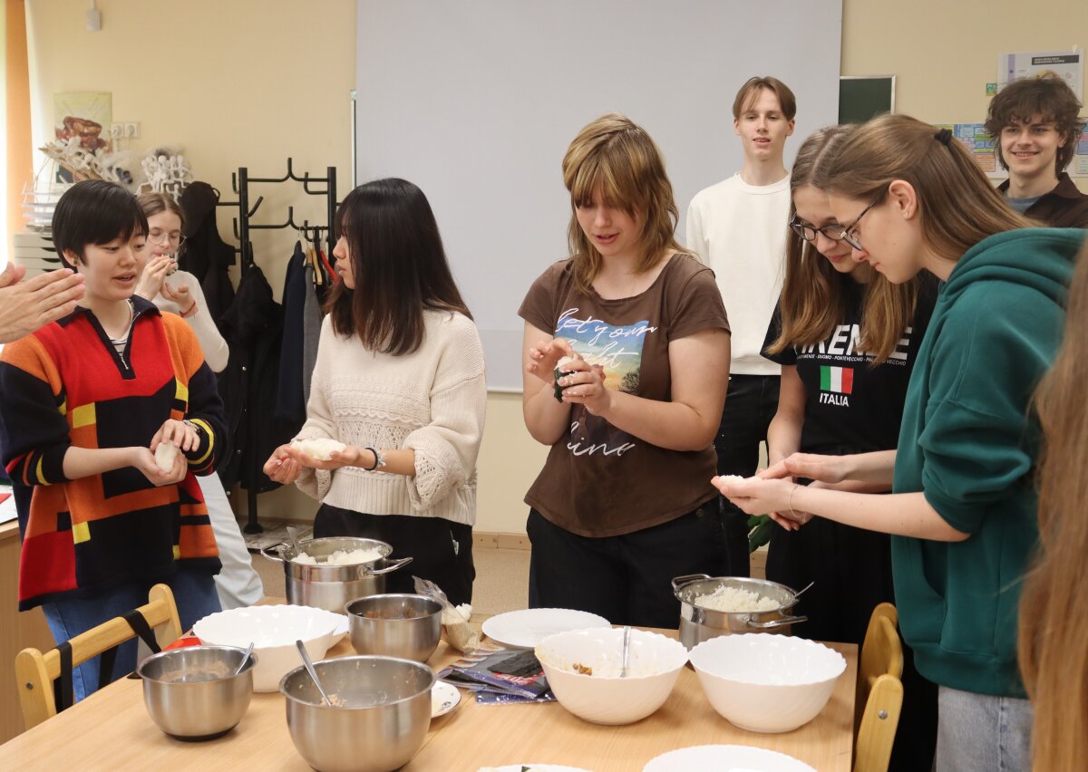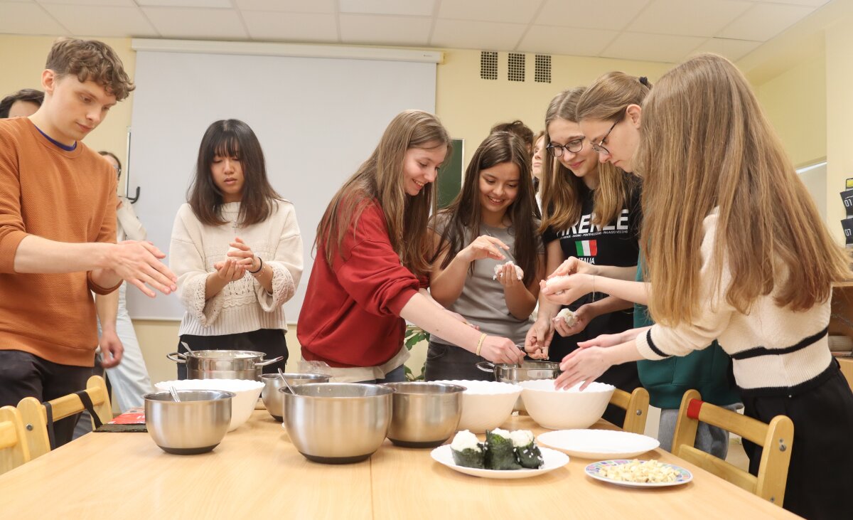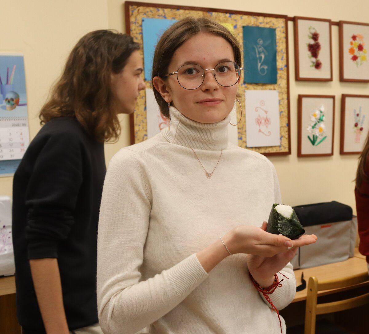 Onigiri Japonijoje – tarsi mums sumuštinis - greitas, patogus ir gardus užkandis, kartais virstantis pagrindiniu patiekalu. Pradžioje studentai pristatė onigiri istoriją, kurios šaknys siekia net III a. pr. m. e. Nors dabartinė jų forma ir receptūra išpopuliarėjo XVII a., šis patiekalas iki šiol išlieka populiarus ir mėgstamas. Po įžangos – smagiausia dalis - patys gaminome onigiri! Iš pradžių atrodęs paprastas procesas pareikalavo šiek tiek kantrybės, bet rezultatas pavyko ne tik gardus, bet ir labai džiuginantis.