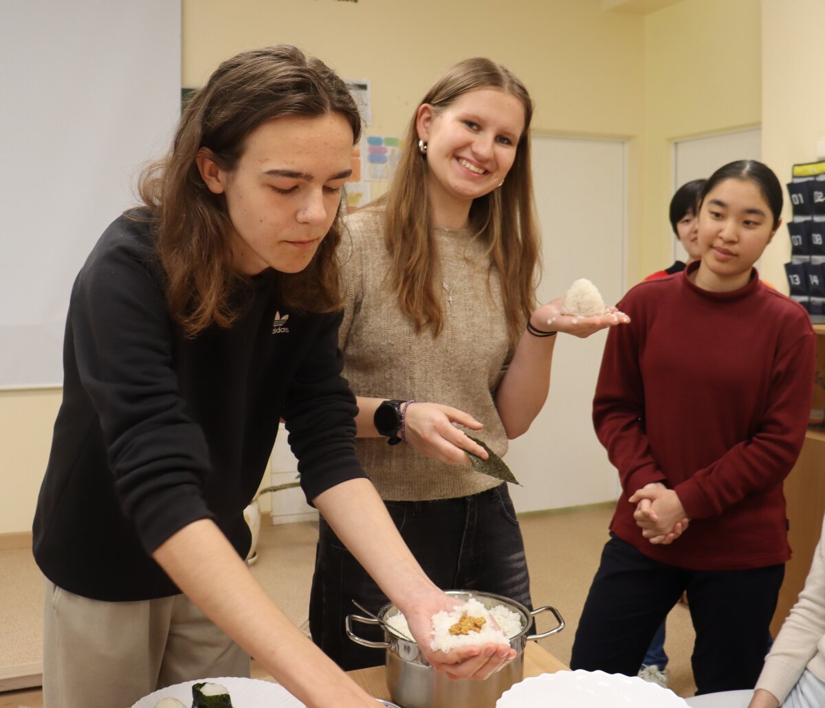 Gimnazijos japonų klubo nariai kartu su VDU japonų klubo Hashi studentais gegužės 16-os popietę praleido labai skaniai, gamindami onigiri – tradicinius japoniškus ryžių trikampius su įdaru.