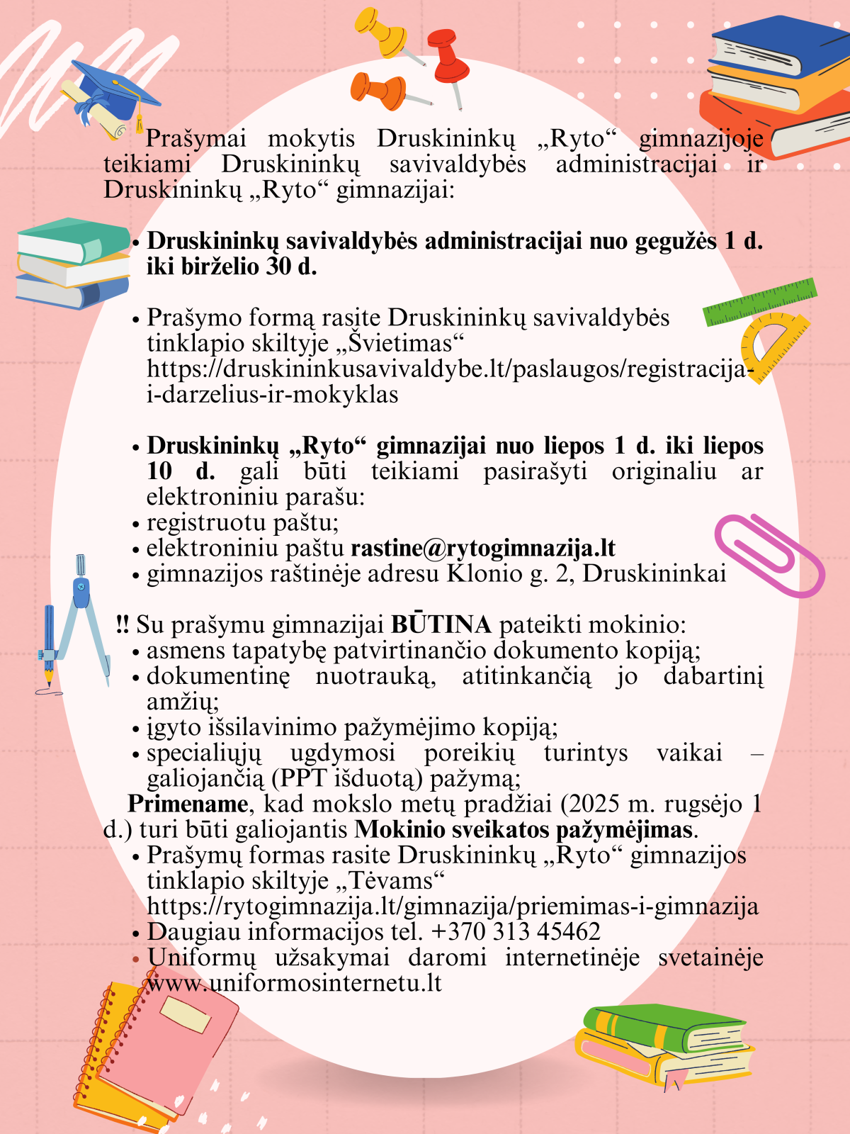 Prašymai mokytis Druskininkų „Ryto“ gimnazijoje teikiami Druskininkų savivaldybės administracijai ir Druskininkų „Ryto“ gimnazijai: