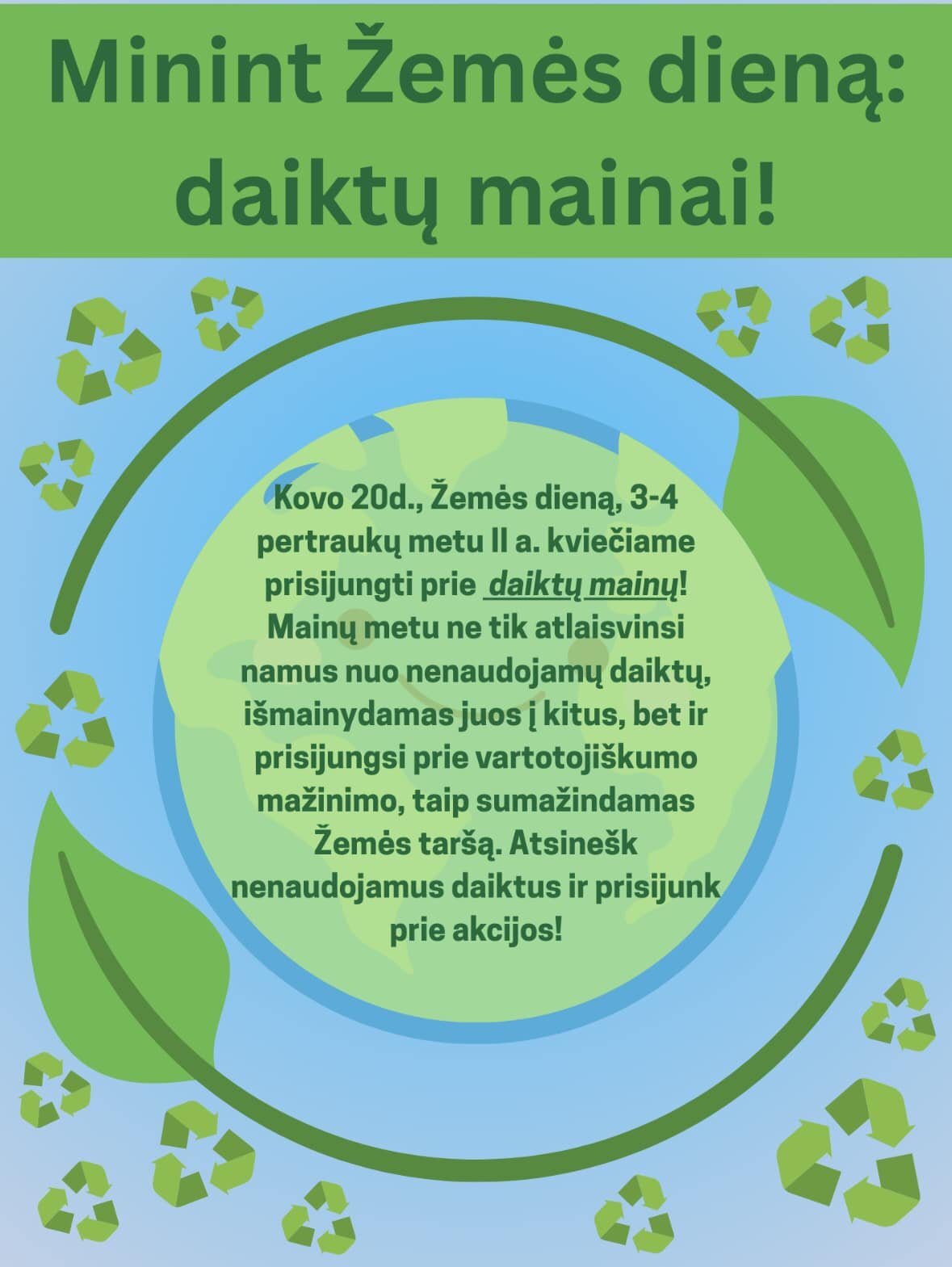 Kovo 20d., Žemės dieną, kviečiame gimnazijos mokinius į daiktų mainus !