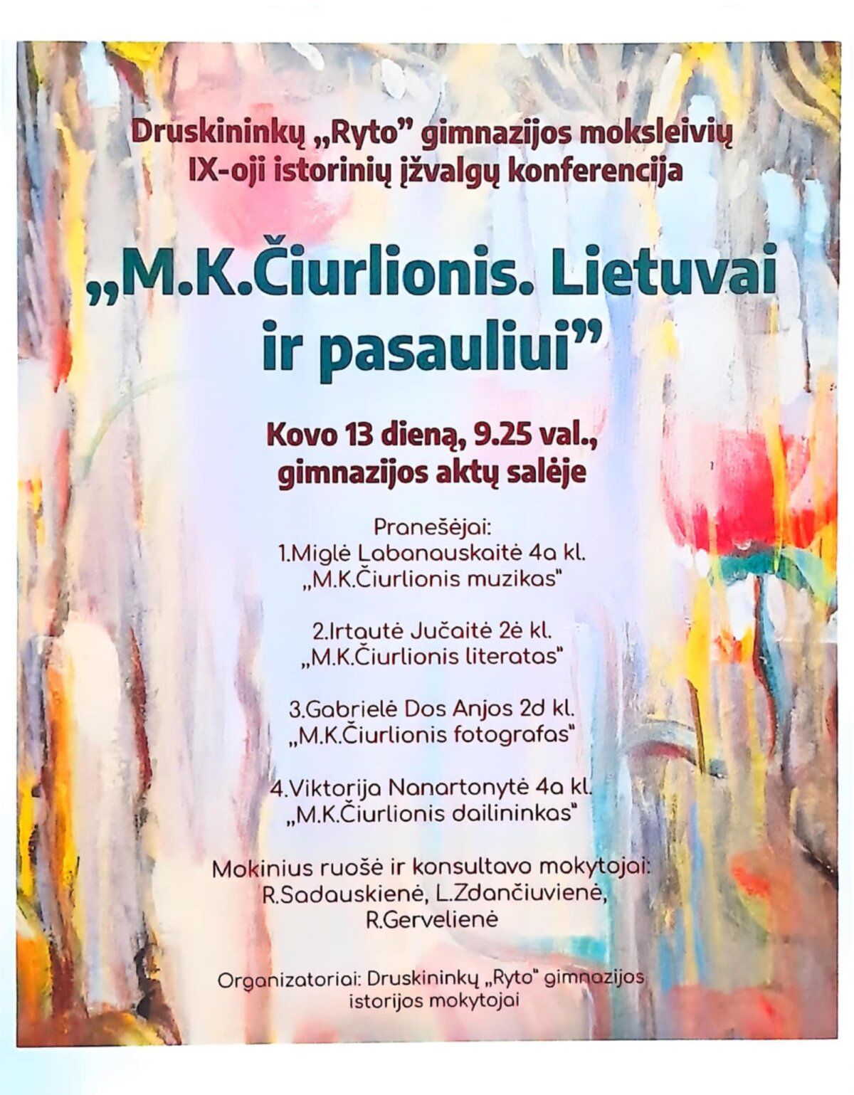 Kviečiame į gimnazijos moksleivių IX-ąją istorinių įžvalgų konferenciją ,,M. K. Čiurlionis. Lietuvai ir pasauliui”