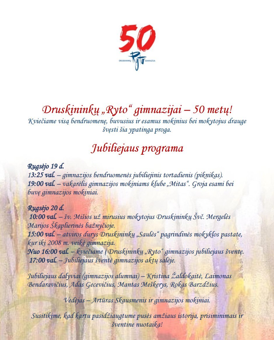 16:00 val. – kviečiame į Druskininkų „Ryto“ gimnazijos jubiliejaus šventę.