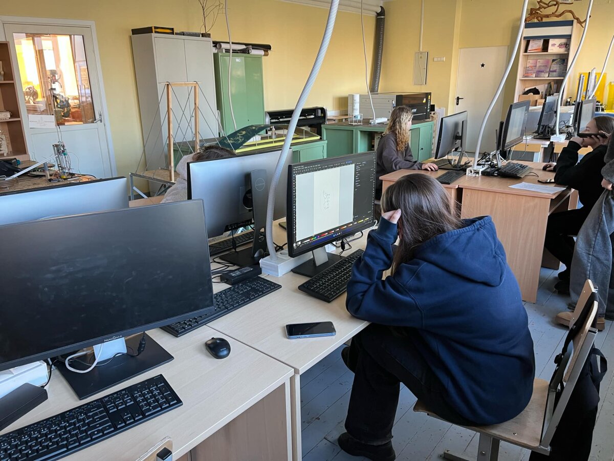 Balandžio 7 d. mūsų inžinerinių technologijų laboratorijoje IIb klasės mokinės, padedamos mokytojos Aušros Markevičiūtės, kūrė individualias autorines dekoracijas – Velykinius margučius. Naudodamos programą „Inkscape“, jos sukūrė dizainus, o su „RD Works“ nustatė parametrus ir atliko gaminių pjovimą lazeriu.