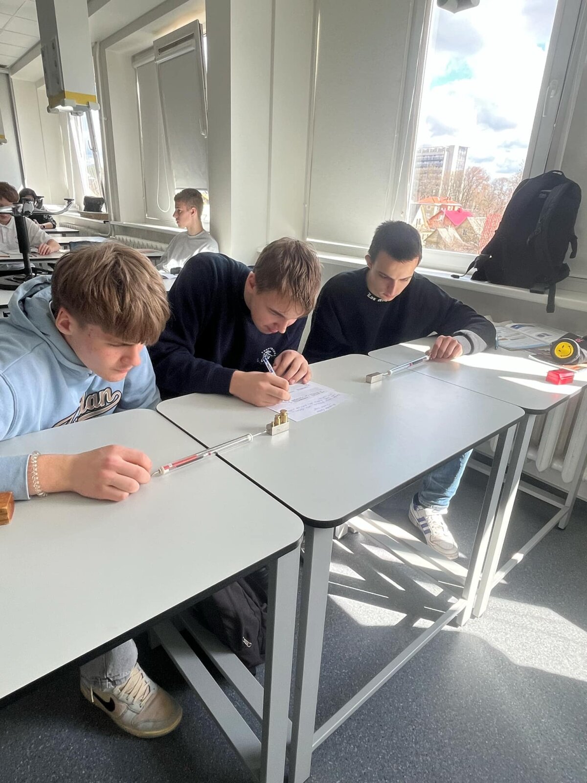 Praktikos darbų metu, vadovaujami fizikos mokytojų D. Bartainienės ir S. Tamulevičienės, mokiniai tyrinėja trinties jėgų rūšis – rimties, slydimo ir riedėjimo trintį – bei aiškinasi, kaip trinties jėga kinta priklausomai nuo apkrovos.