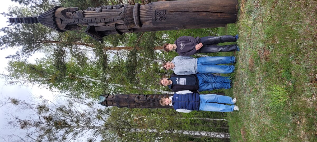 Pakeliui į namus mokiniai sustojo prie medinių M. K. Čiurlionio kelio skulptūrų. M. K. Čiurlionio kelias – medžio skulptūrų ansamblis, sukurtas 1975-1976 m. tautodailės meistrų, pažymint M. K. Čiurlionio šimtąsias gimimo metines.