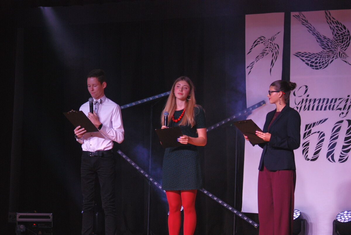 Šventinę programą vedė dabartiniai mokiniai Milena Juodeškaitė, Justina Plukytė, Lukas Markelionis ir gimnazijos alumnas Tomas Kemzūra. Muzikinė dalis buvo ypatingai spalvinga: