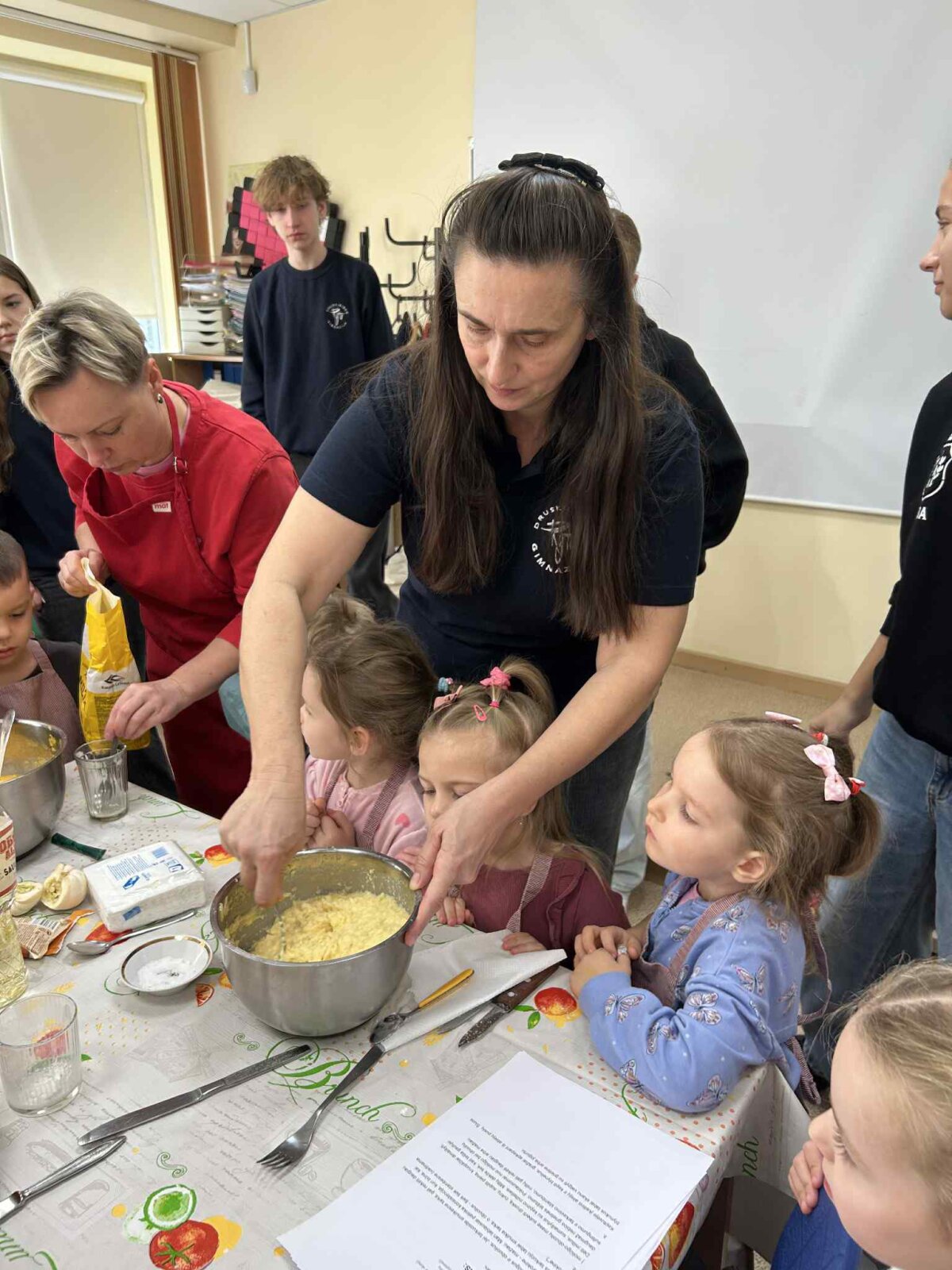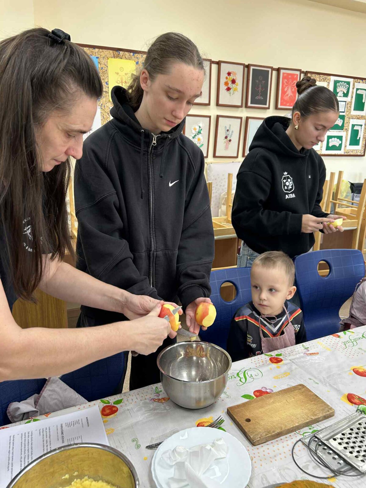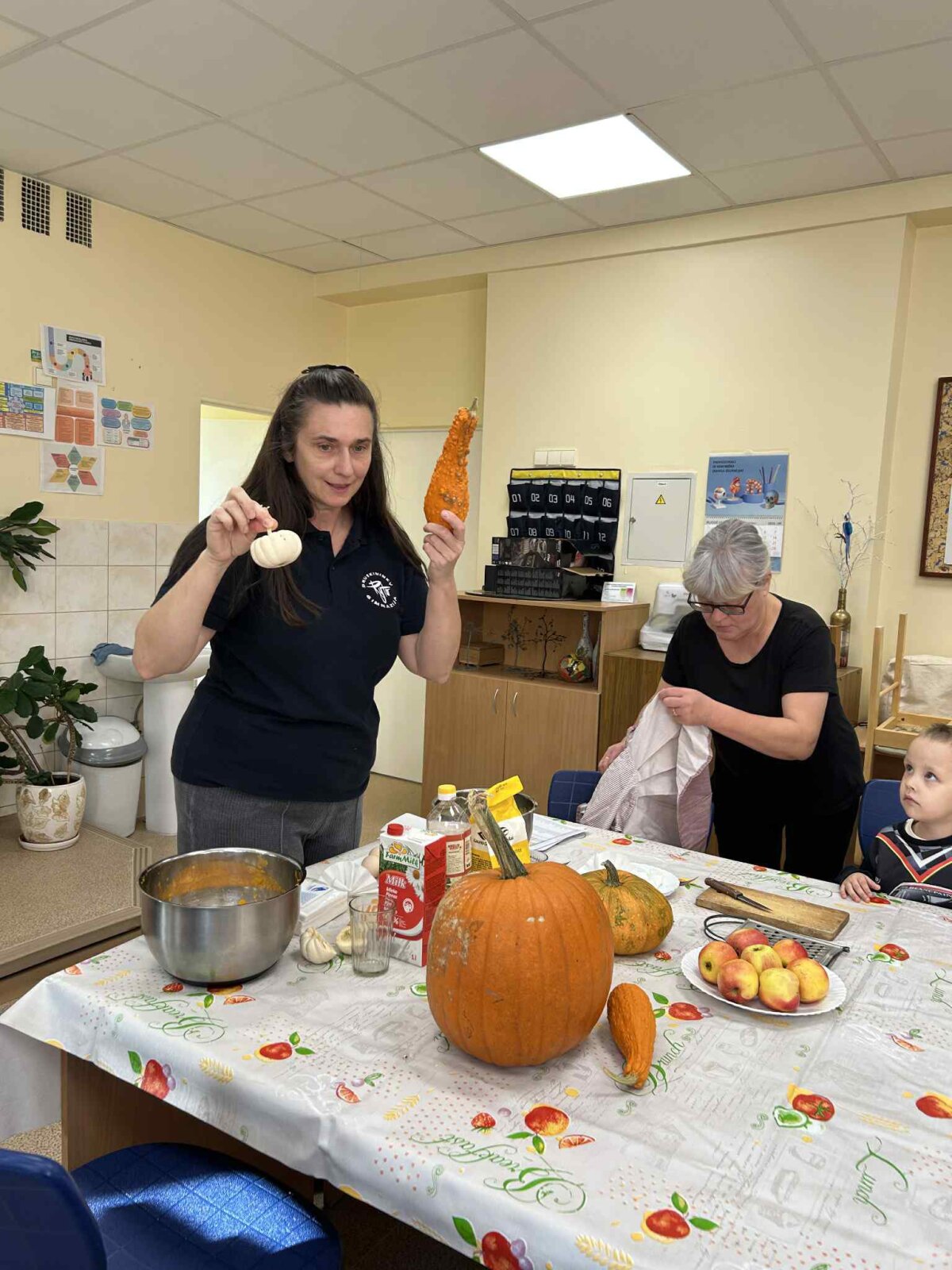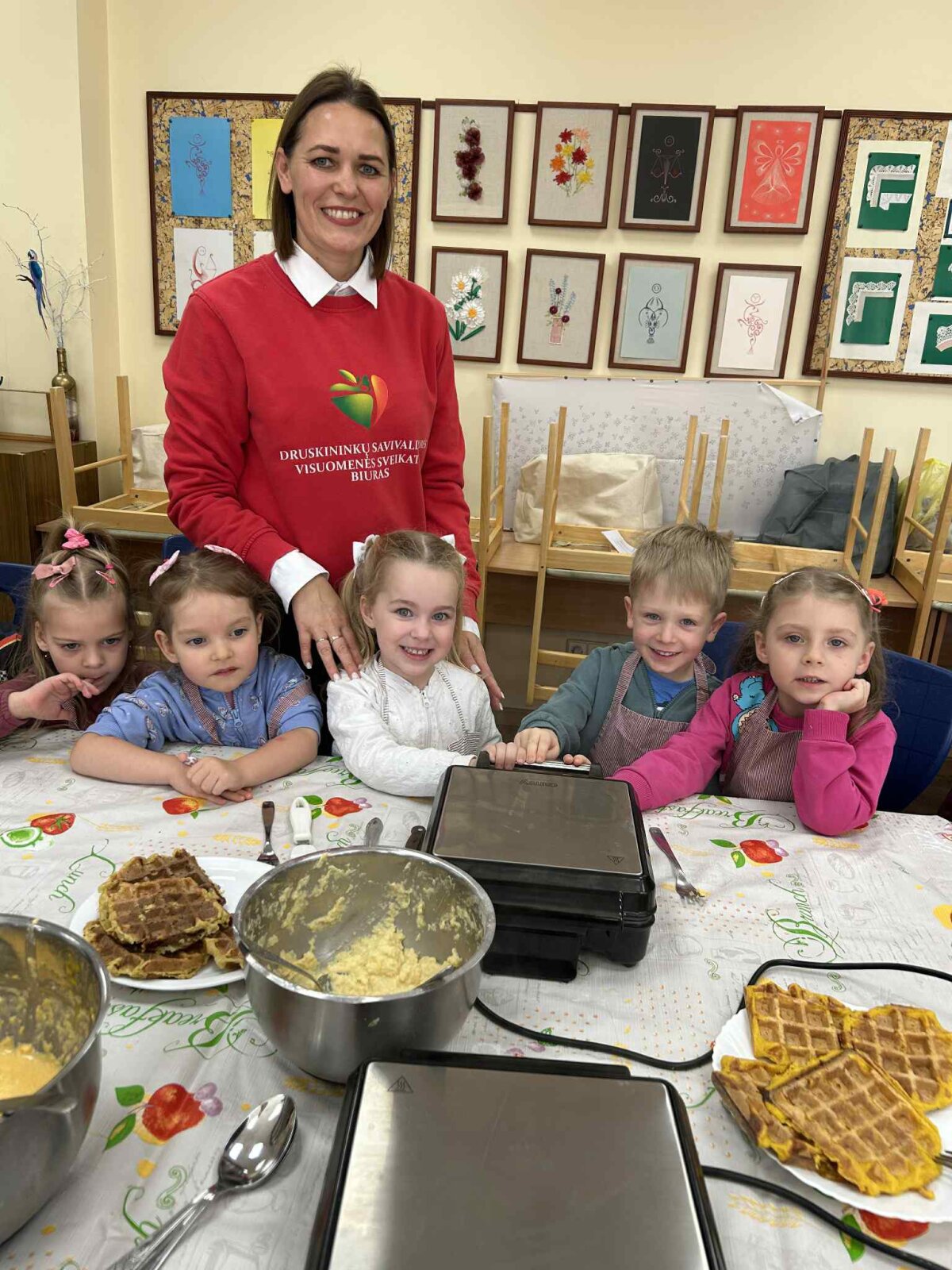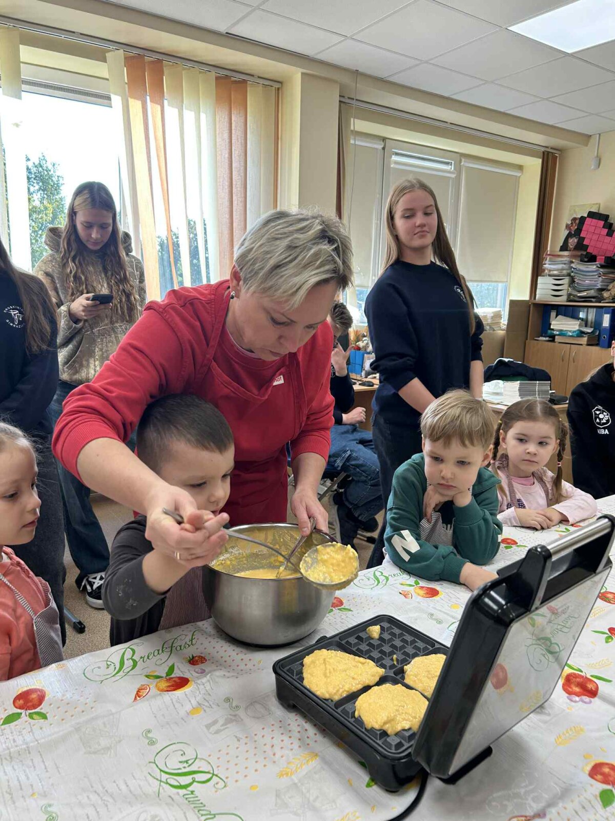 Technologijų kabinete kartu su mokytoja Edita Nevuliene-Nemunaitiene bei visuomenės sveikatos specialistėmis S. Vilkeliene ir L. Sadauskiene visi kepė gardžius moliūgų blynus, kalbėjosi apie sveiką mitybą ir dalijosi gera nuotaika.