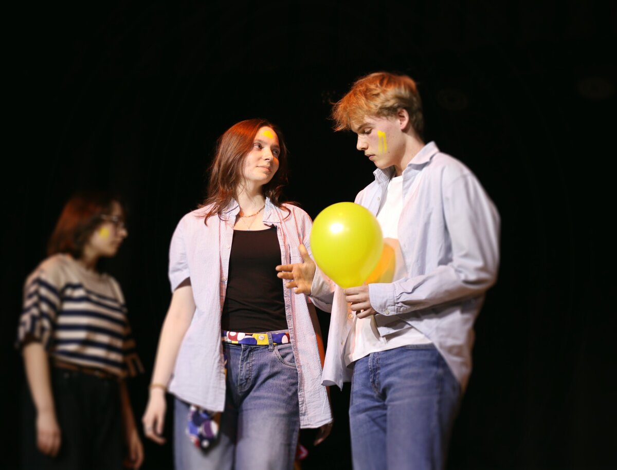 Gimnazijos III klasės teatro grupės spektaklyje ,,Geltona lapė“ (vadovė / autorė Ramunė Karlonienė) jauno žmogaus dilemos buvo sprendžiamos pasitelkus įvairias simbolines formas: lėlių pasaulio / teatro prototipus (kareivis, klounas, porcelianinė lėlė) ir abstrakčiuosius vaidmenis (vanduo, kalinys, dainuojanti ledų pardavėja). Pagrindinio veikėjo ir kaltininko Jono (Benas Šukys, III d) gimtadienio netikėtumai, ligoninės gydytojų komandos tarpusavio santykiai, Geltonosios Lapės personažas žmonių pasaulyje – gairiniai ženklai, kurių laikydamiesi drauge su teatro grupe kūrėme spektaklį. O muzikinių intarpų paieškos – Gytės Vaickelionytės (III d) kompetencija – sulipdė scenas į vieną kūrinį.