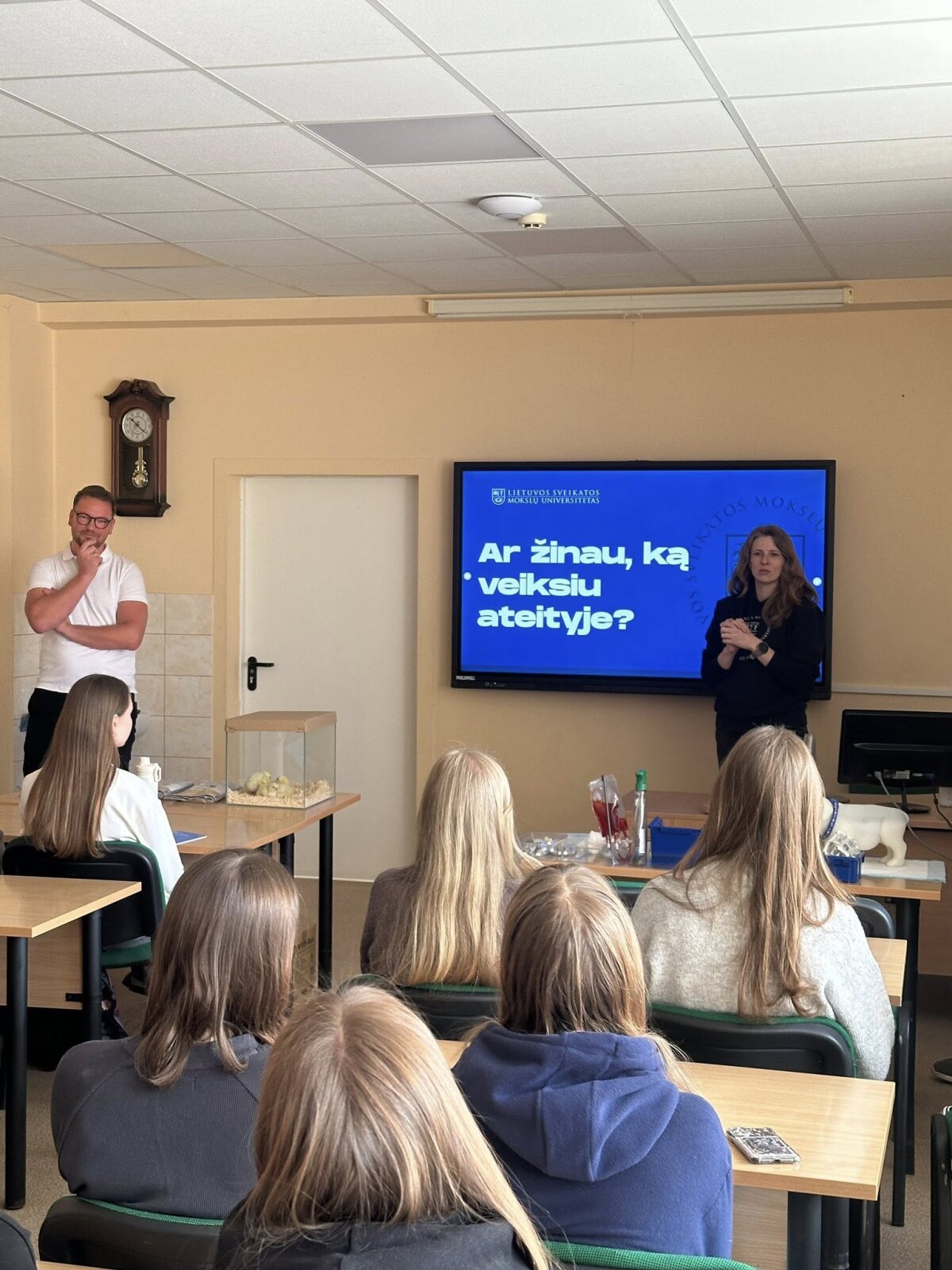 Šiandien, balandžio 10 d., mūsų gimnazijoje lankėsi Lietuvos sveikatos mokslų universiteto (LSMU) dėstytojai, studentai ir absolventas. Jie supažindino mokinius su įvairiomis LSMU siūlomomis studijų programomis, paaiškino konkursinio balo sandarą bei išsamiau pristatė veterinarijos gydytojo profesiją.