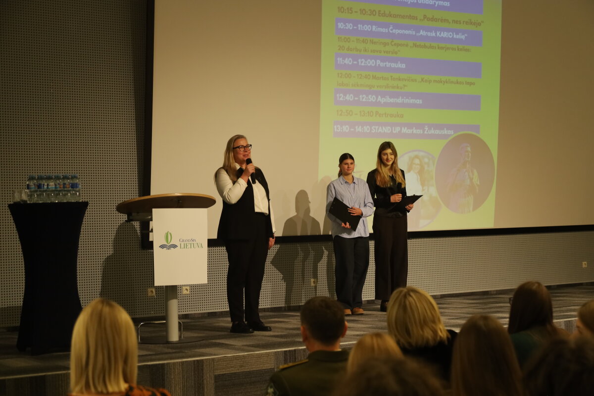 Didžiojoje salėje „Nemunas“ – įkvepiantys verslo atstovų pranešimai apie karjeros kelius, iššūkius ir sėkmės istorijas.